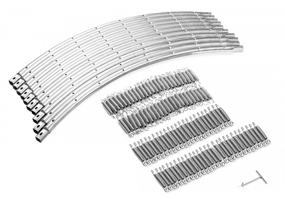 - Пружин. В модели батута Atlas Sport 312см их 64 штуки. Они крепятся к прыжковому полотну треугольными карабинами. Карабины, в свою очередь, надеты на петли, каждая из которых пристрочена к кругу восемью фабричными швами. Обрыв петли, отсоединение пружины исключены.