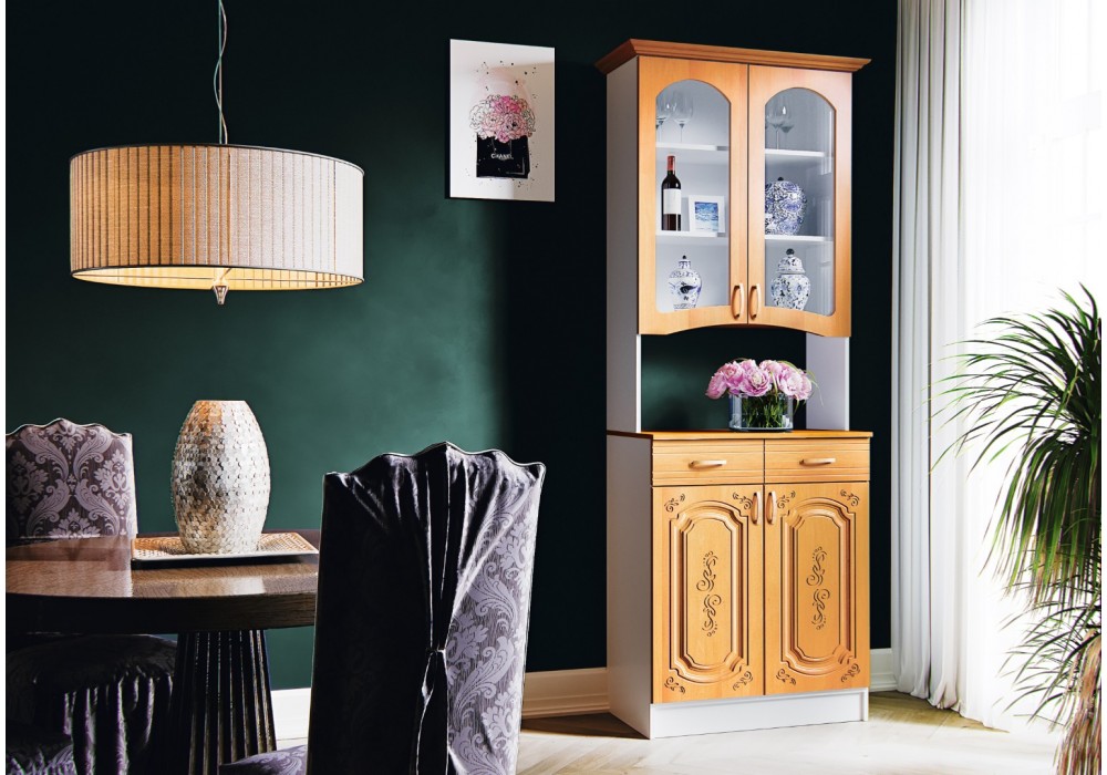 В верхней части буфета шкаф с стеклополками, где займут свое место тарелки с декором и бокалы. В центральной части нища с просторной столешницей. Нижнюю часть буфета составляет шкафчик, разделенный на две зоны для хранения: вверху два выдвижных ящика, под ними за распашными дверцами располагаются полки для хранения посуды.