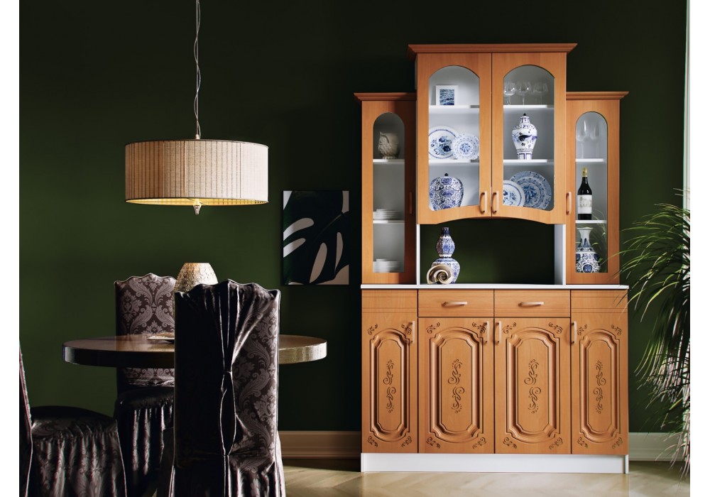 В верхней части буфета шкафчики со стеклянными фасадами, где займут свое место тарелки с декором и бокалы. В центральной части нища с просторной столешницей. Нижнюю часть буфета составляет вместительный шкафчик-комод, разделенный на зоны для хранения: выдвижные ящики, шкафчики с полками за закрытыми сворками.