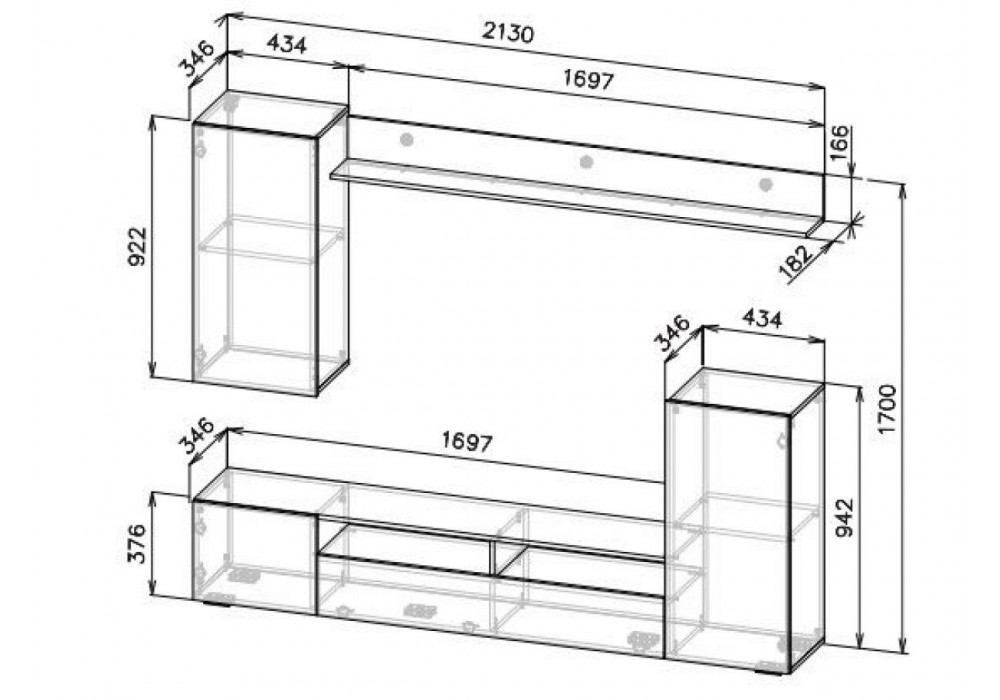 - Тумба. (ШхВхГ) 2131х942х346 мм. Описание: Элемент представляет собой тумбу с пеналом. Имеет 3 отсека для хранения и открытые ниши. Отсеки для хранения комплектуются распашными створками, отсек под открытыми нишами комплектуется откидной створкой без газлифтов. В пенале устанавливается съемная полка. Тумба собирается на любую сторону