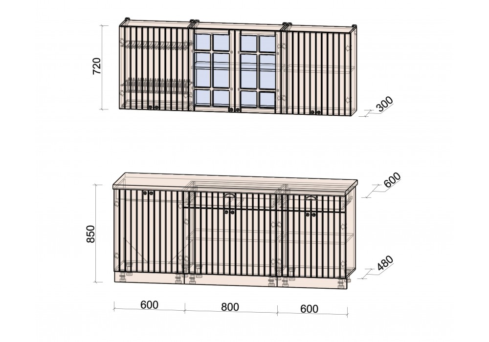 - Высота напольных шкафов с учетом столешницы и ножек: 850 мм.