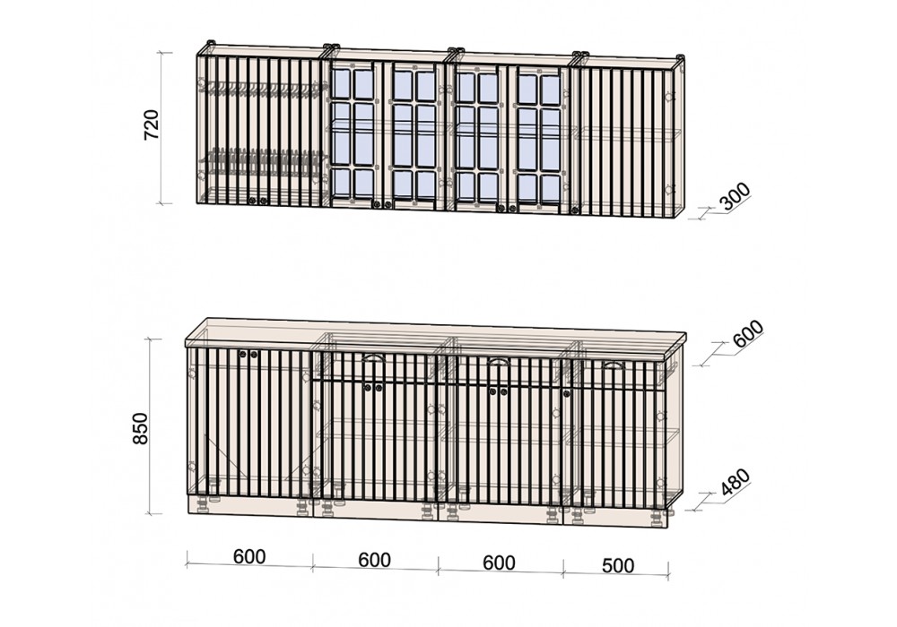 - Высота напольных шкафов с учетом столешницы и ножек: 850 мм.
