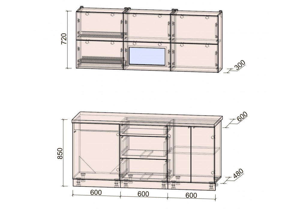 - Столешница (38 мм) отдельная на каждый шкаф или цельная (без увеличения стоимости);