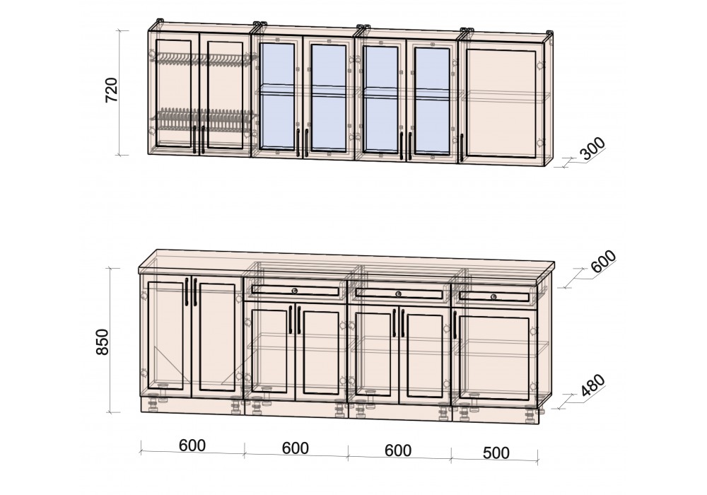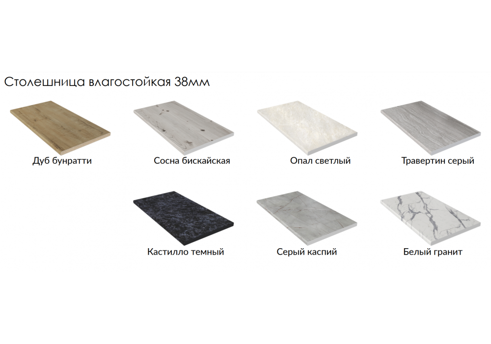 - Столешница (38 мм) отдельная на каждый шкаф или цельная (без увеличения стоимости);