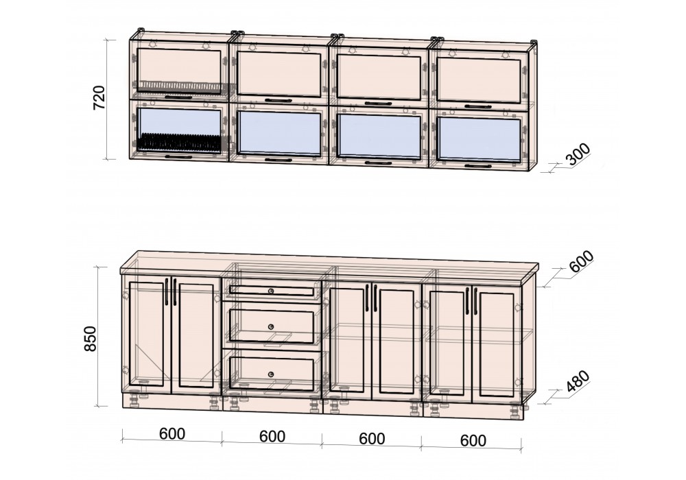 - Столешница (38 мм) отдельная на каждый шкаф или цельная (без увеличения стоимости);