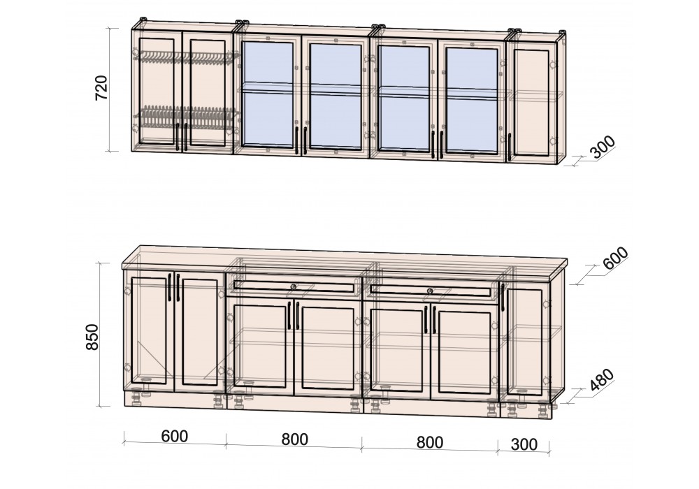 - Столешница (38 мм) отдельная на каждый шкаф или цельная (без увеличения стоимости);