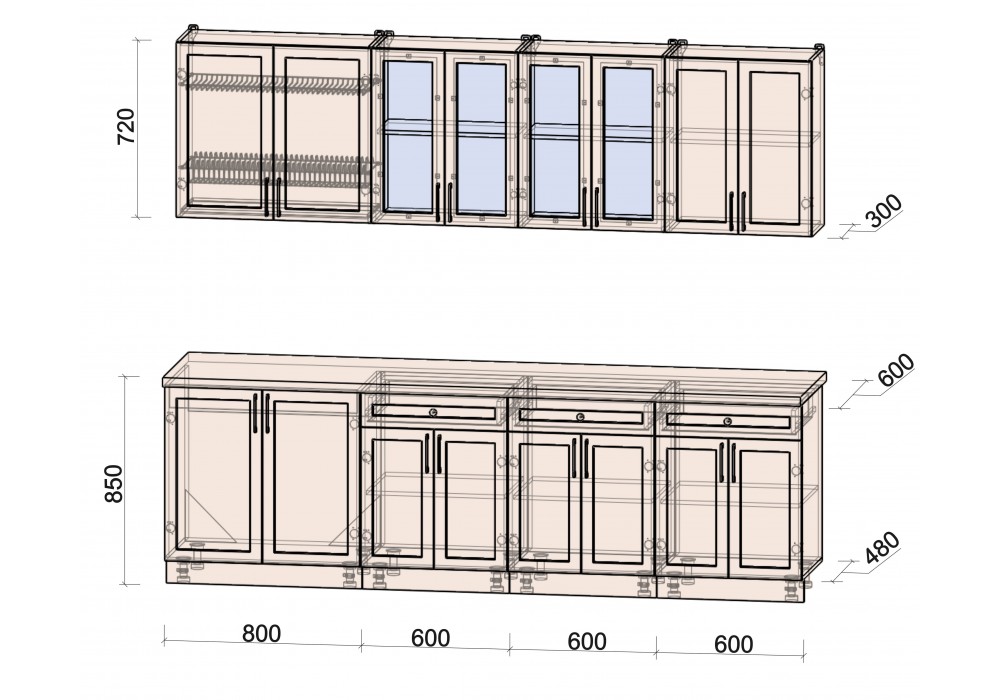 - Столешница (38 мм) отдельная на каждый шкаф или цельная (без увеличения стоимости);