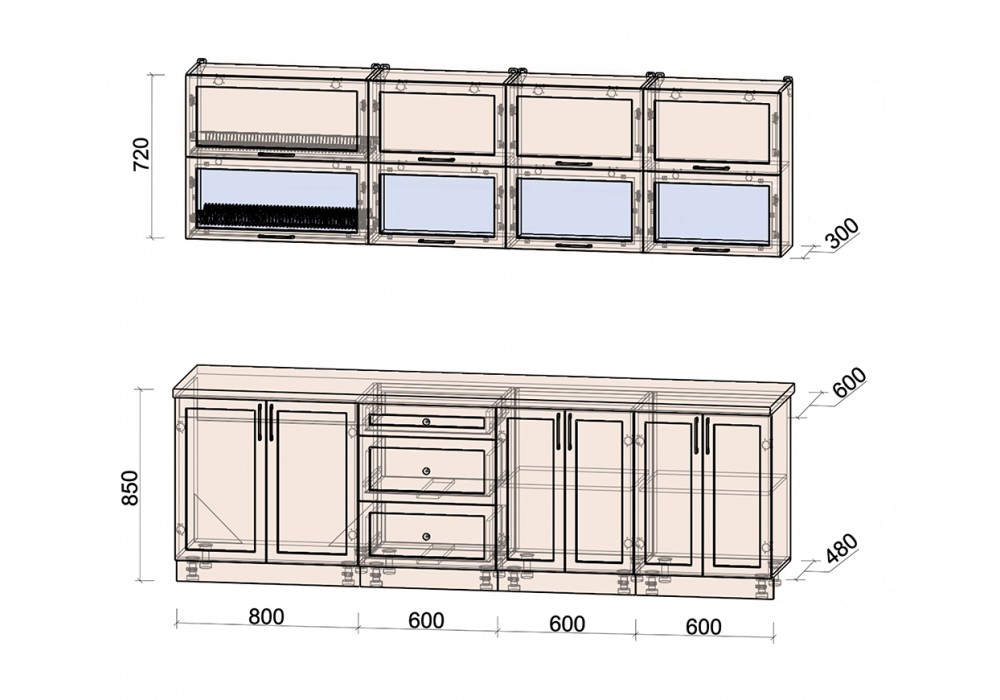 - Столешница (38 мм) отдельная на каждый шкаф или цельная (без увеличения стоимости);