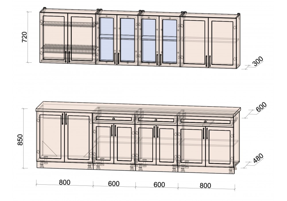- Столешница (38 мм) отдельная на каждый шкаф или цельная (без увеличения стоимости);