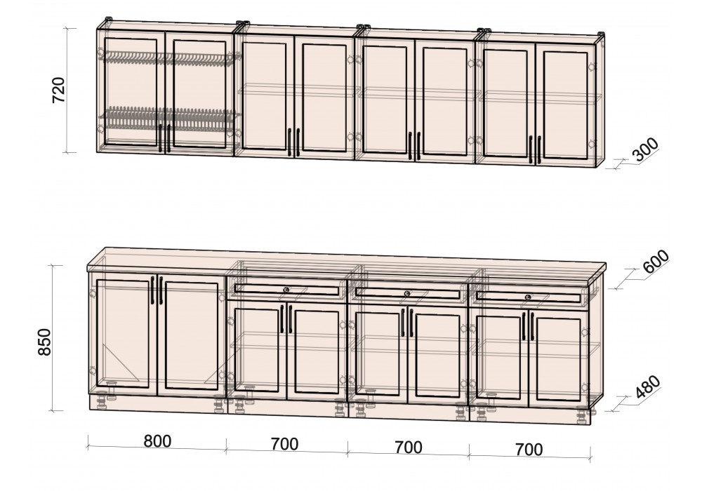 - Столешница (38 мм) отдельная на каждый шкаф или цельная (без увеличения стоимости);
