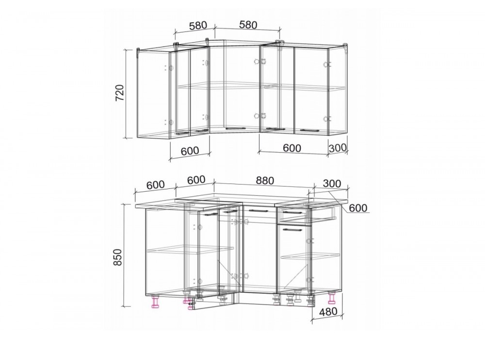 Высота напольных шкафов с учетом столешницы и ножек: 850 мм.