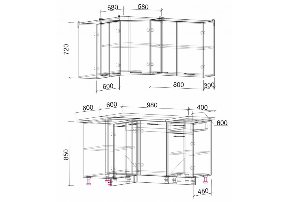 Высота напольных шкафов с учетом столешницы и ножек: 850 мм.