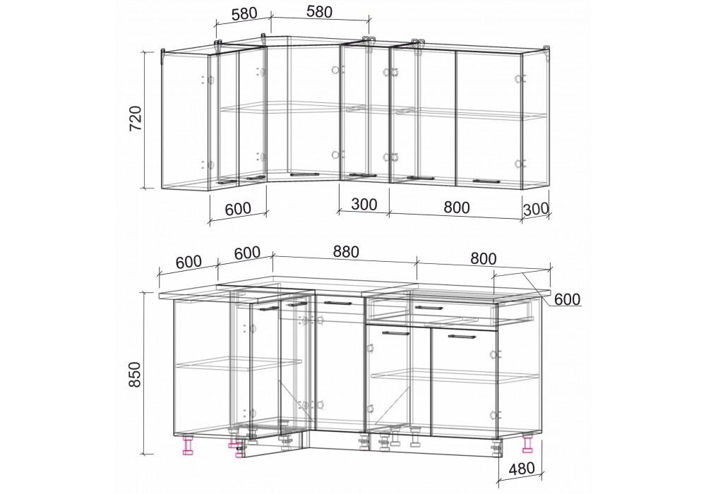 Высота напольных шкафов с учетом столешницы и ножек: 850 мм.
