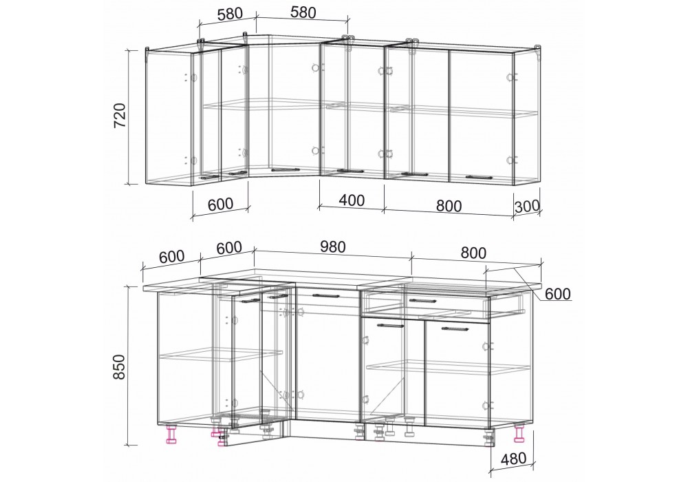 Высота напольных шкафов с учетом столешницы и ножек: 850 мм.