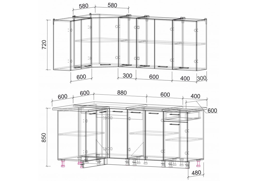 Высота напольных шкафов с учетом столешницы и ножек: 850 мм.