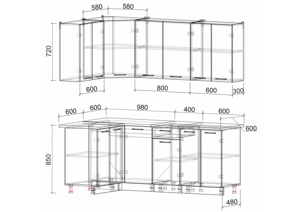 Высота напольных шкафов с учетом столешницы и ножек: 850 мм.