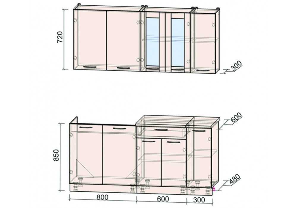 - Высота напольных шкафов с учетом столешницы и ножек: 850 мм.