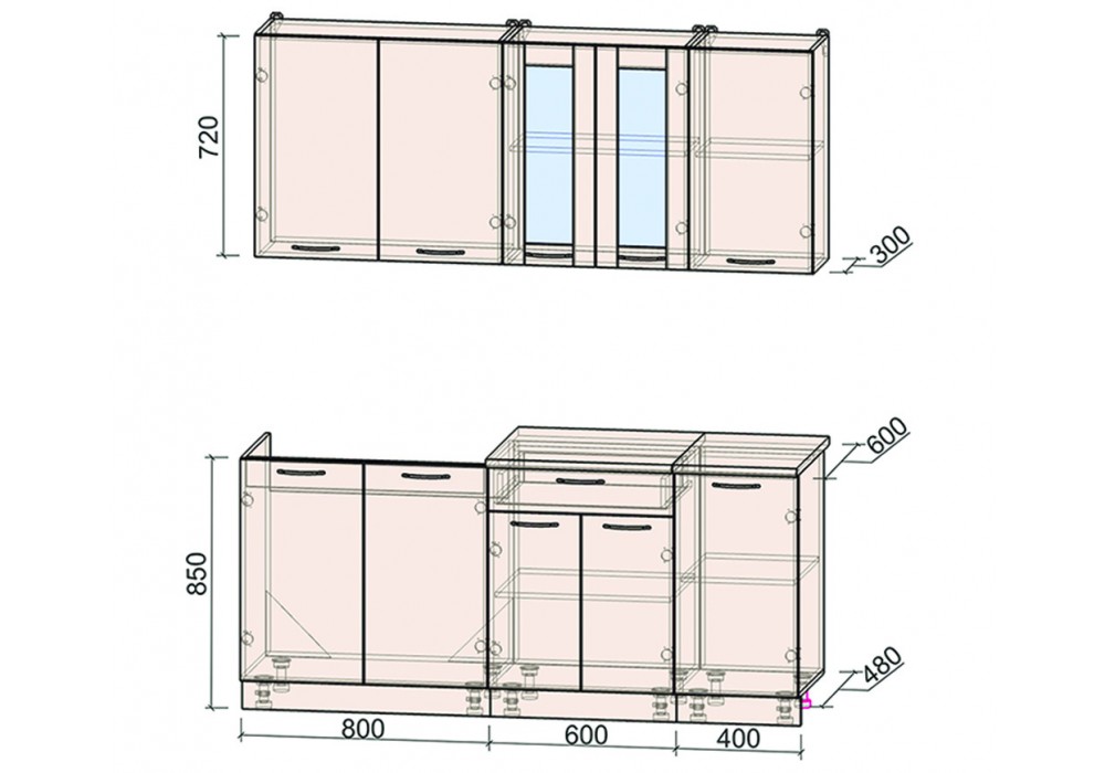 - Глубина напольных шкафов без столешницы: 480 мм.