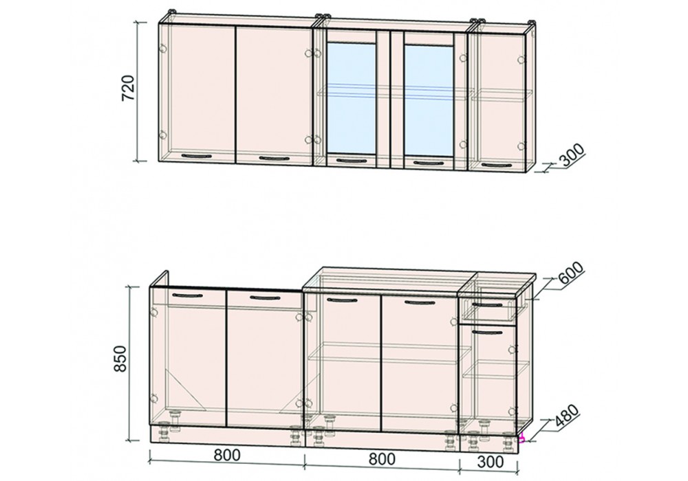 - Высота напольных шкафов с учетом столешницы и ножек: 850 мм.