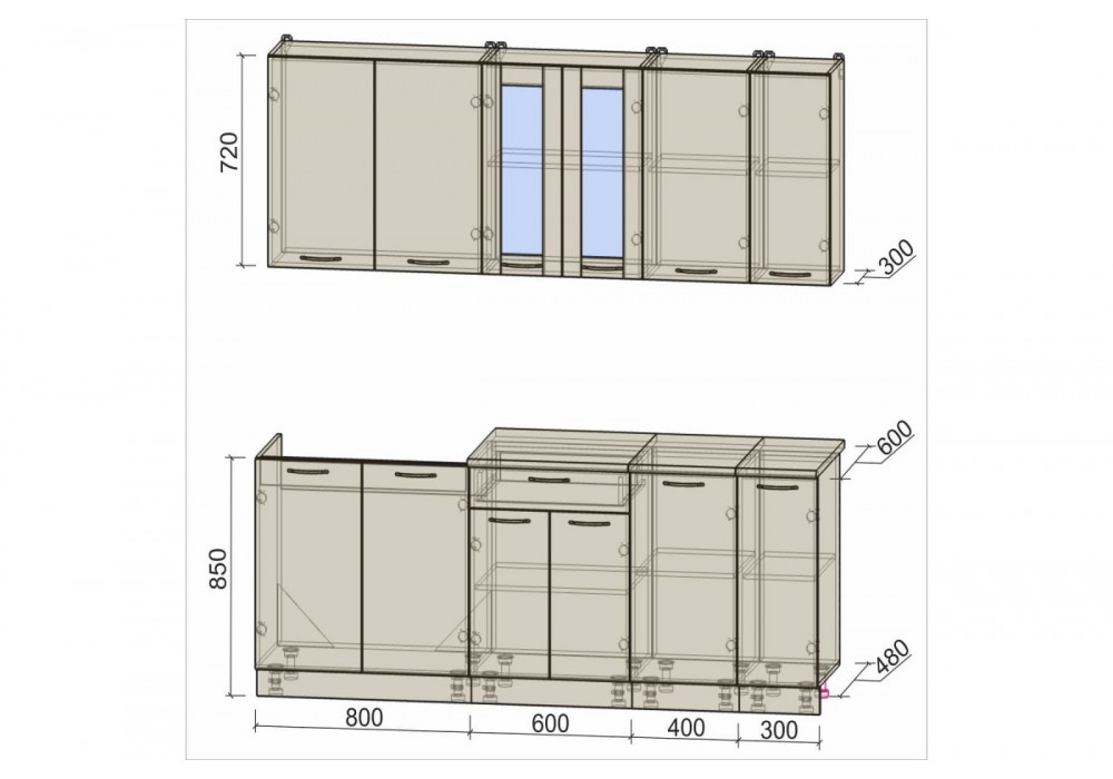 - Глубина напольных шкафов без столешницы: 480 мм.