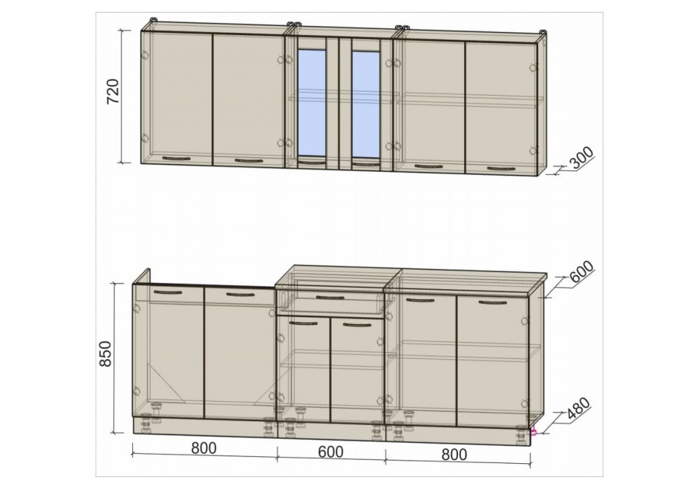 - Глубина напольных шкафов без столешницы: 480 мм.