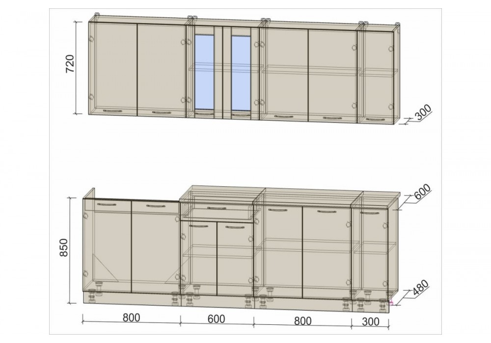 - Высота напольных шкафов с учетом столешницы и ножек: 850 мм.