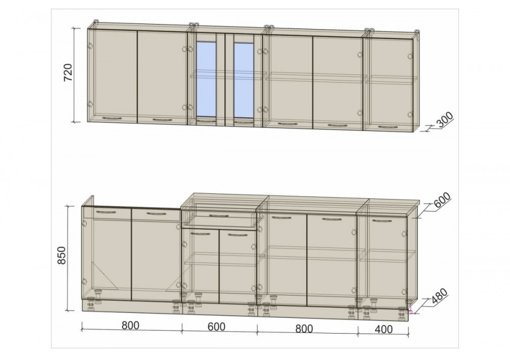 - Высота напольных шкафов с учетом столешницы и ножек: 850 мм.