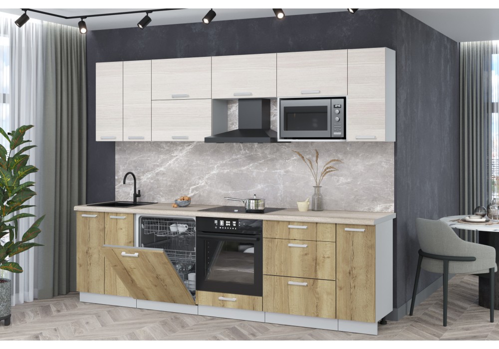 Кухонный гарнитур Мила Лайт 2,7-ПМ2 (Вудлайн кремовый/Дуб золотой/Травертин) фабрика Интерлиния