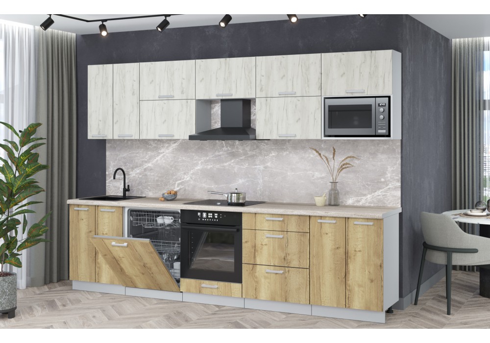 Кухонный гарнитур Мила Лайт 3,0-ПМ2 (Дуб белый/Дуб золотой/Травертин) фабрика Интерлиния