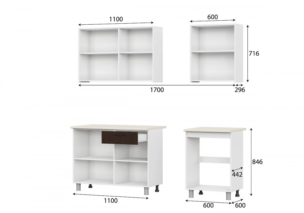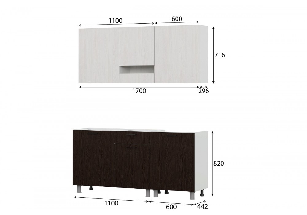 Габариты: общая ширина составляет 1,7 метра. Столы рабочие: глубина столов с учетом фасадов — 442 мм, высота столов с опорами — 820 мм. Верхние модули: глубина шкафов с учетом фасадов — 296 мм, высота шкафов 720 мм.