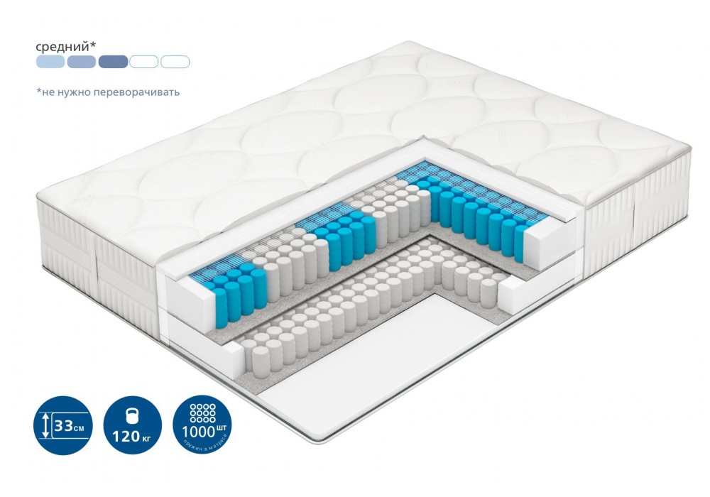 Высокий односторонний «двухэтажный» матрас c 7-зонным блоком независимых пружин и изысканным чехлом. Качество отдыха, как в дорогом отеле!