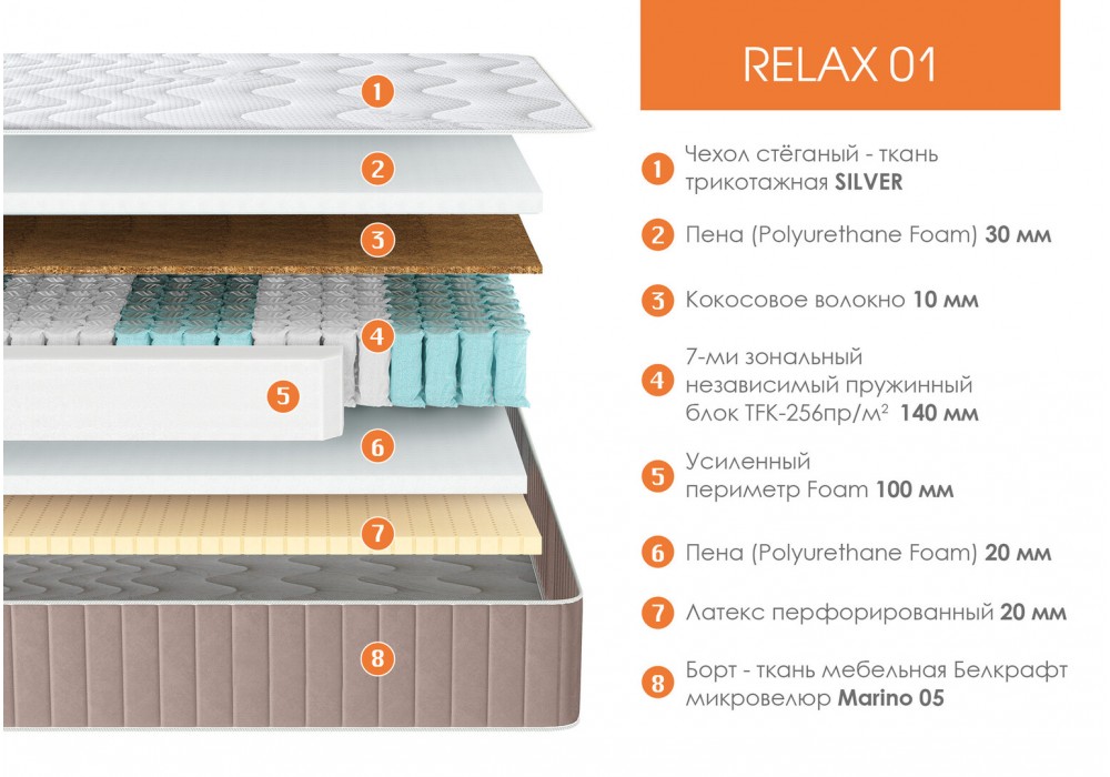 Матрас «Relax01» — ортопедическое изделие для сна и отдыха, изготовлено на основе 7ми зонального блока независимых пружин TFK (256 пружин на м²) для правильной поддержки позвоночника, а также кокосовой койры для жёсткости и пенополиуретана (Orto Soft), добавляющего комфорт. Одна сторона матраса — средней жёсткости, вторая — пенополиуретан и латекс для повышенной комфортности среде мягкая . В модели по всему периметру используется короб из пенополиуретана шириной 100 мм, что повышает прочность и препятствует деформации края боковины.