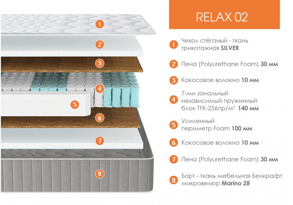Матрас «Relax02» — ортопедическое изделие для сна и отдыха, изготовлено на основе 7ми зонального блока независимых пружин TFK (256 пружин на м²) для правильной поддержки позвоночника, а также кокосовой койры для жёсткости и пенополиуретана (Orto Soft), добавляющего комфорт.. В модели по всему периметру используется короб из пенополиуретана шириной 100 мм, что повышает прочность и препятствует деформации края боковины.