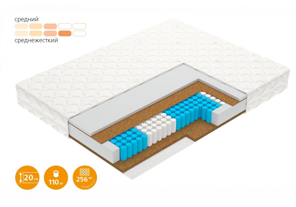 Блок независимых пружин плотностью 256 шт/м2. Пять выраженных зон поддержки обеспечивают больший ортопедический эффект, равномерное распределение нагрузки на матрас и дарят комфорт во время сна. - Кокосовая койра5
