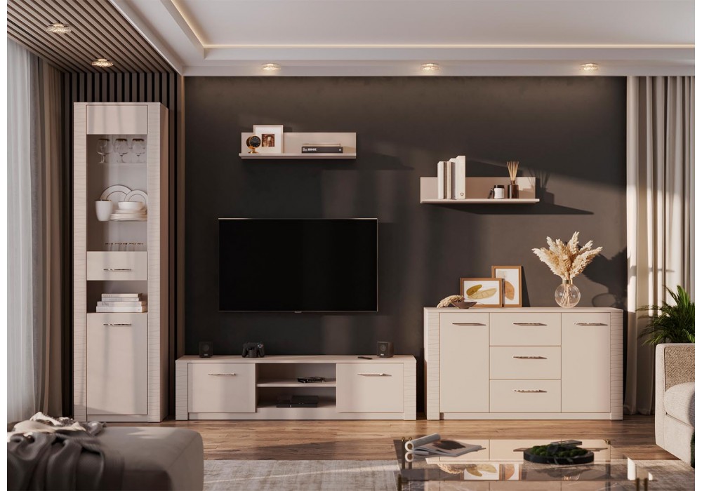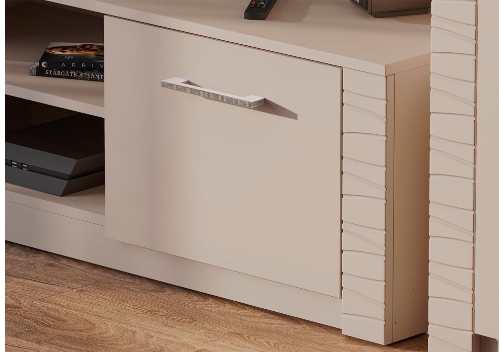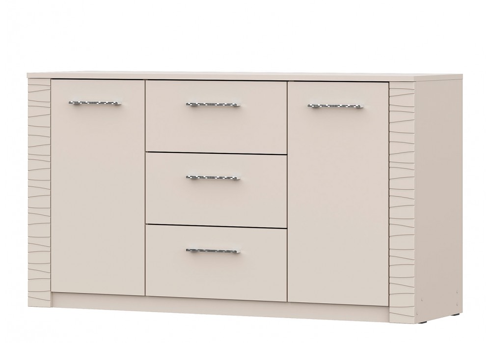 Комод c распашными створками, декоративными элементами из МДФ в ПВХ пленке с фрезеровкой и с тремя выкатными ящиками на роликовых направляющих. Слева и справа отсеки для хранения с полкой. Крайние створки крепятся на декоративные планки из МДФ. Фасады накладные.