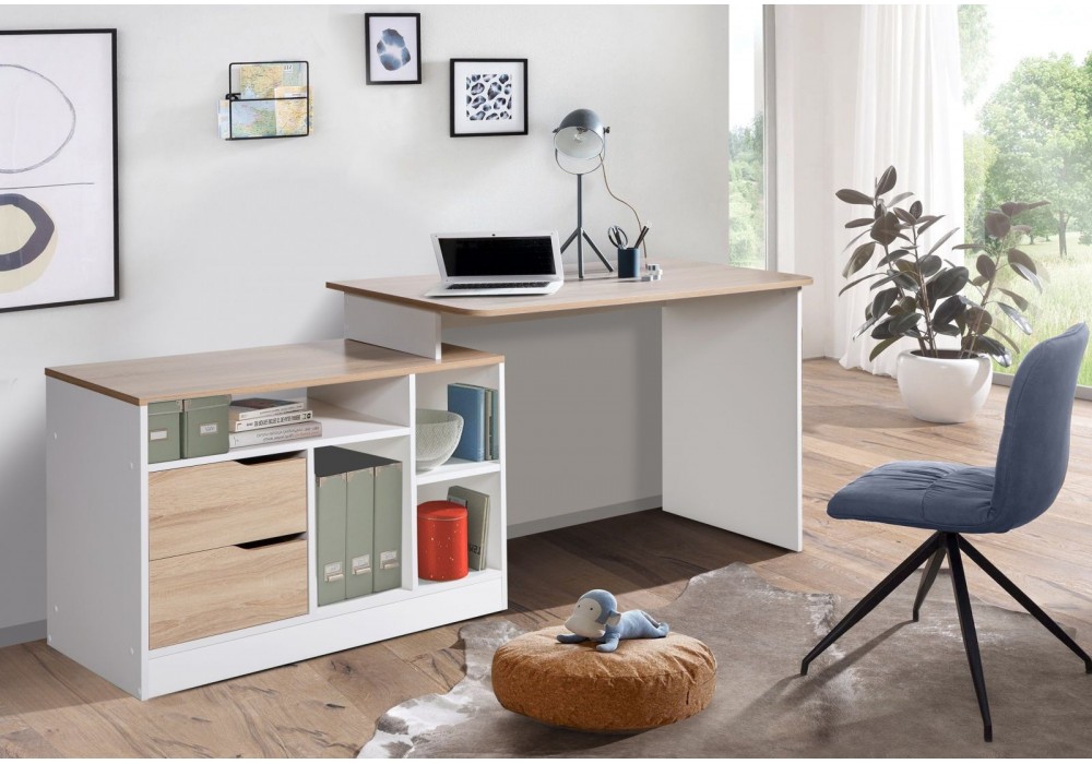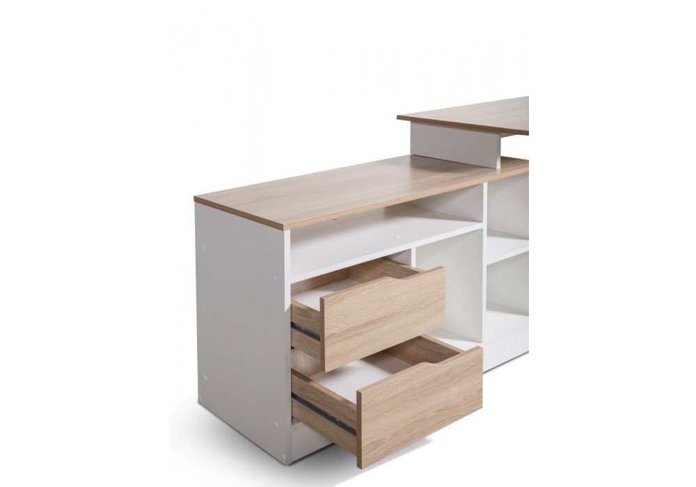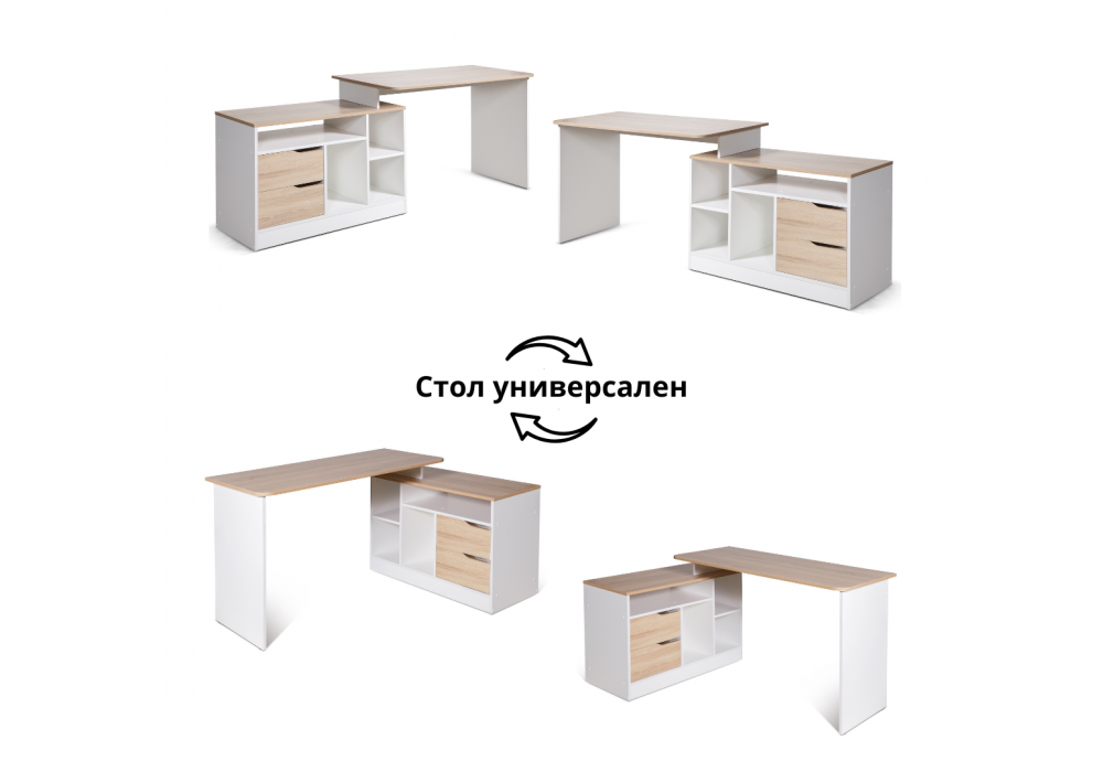 Письменный стол с опорной тумбой. Опорная тумба состоит из четырех отделений, одно из которых укомплектовано полкой. Опорная тумба имеет 2 выдвижных ящика с фрезерованными ручками. Надежное соединение столешницы с опорной тумбой осуществляется через проставку высотой 125мм.Конструкция стола предусматривает левое и правое расположение опорной тумбы.