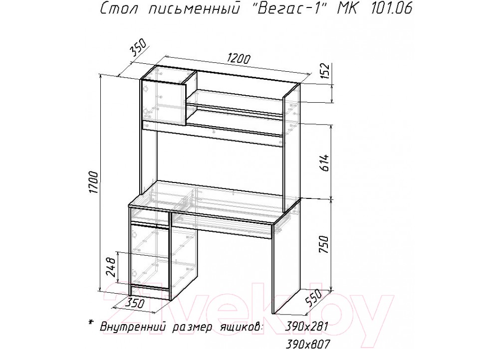 Основной особенностью модели будет полноценное рабочее место. Два больших выдвижных ящика и глубокая ниша с полкой за дверью позволит хранить все рабочие принадлежности в одном месте. Стол Вегас-1 укомплектован надстройкой.Стол выполнен в минималистичном дизайне с преобладанием простых линий и углов. Практичность, функциональность и актуальный дизайн.