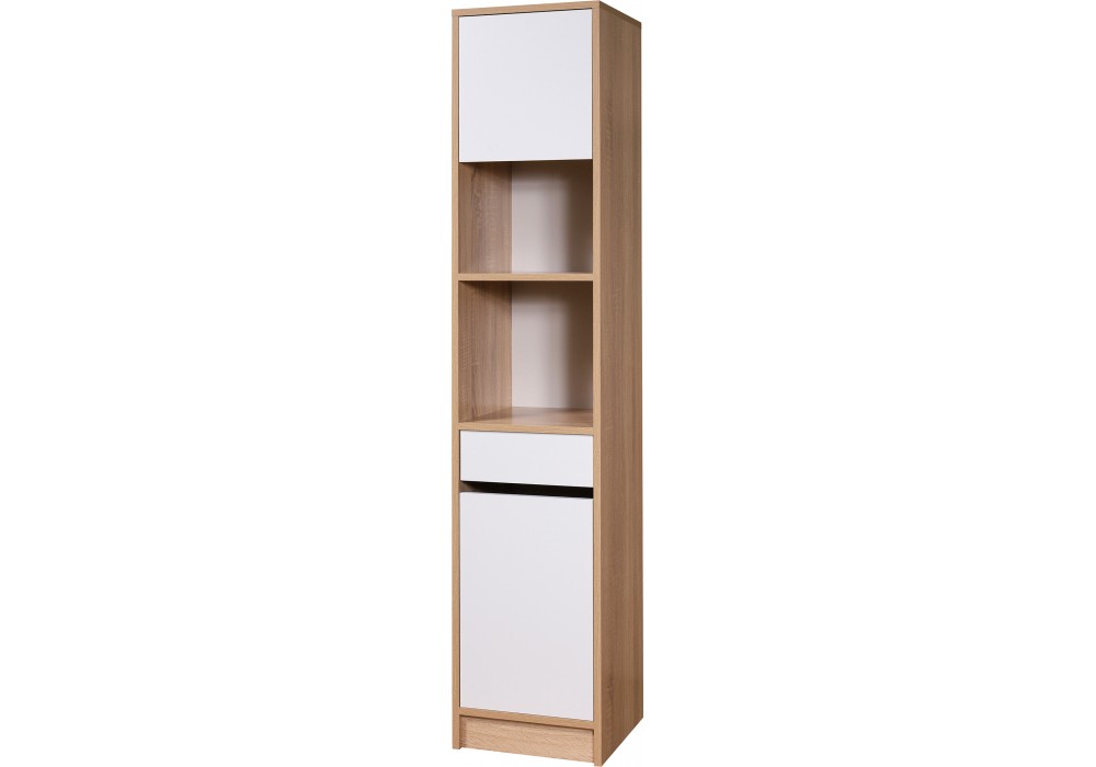 Стеллаж укомплектован выдвижным ящиком и двумя закрытыми секциями с дверями. Нижняя секция разделена полочкой. Также есть открытая ниша, в которой разместятся книги или предметы декора. Исполнение стеллажа универсальное, то есть двери могут открываться, как влево, так и вправо.