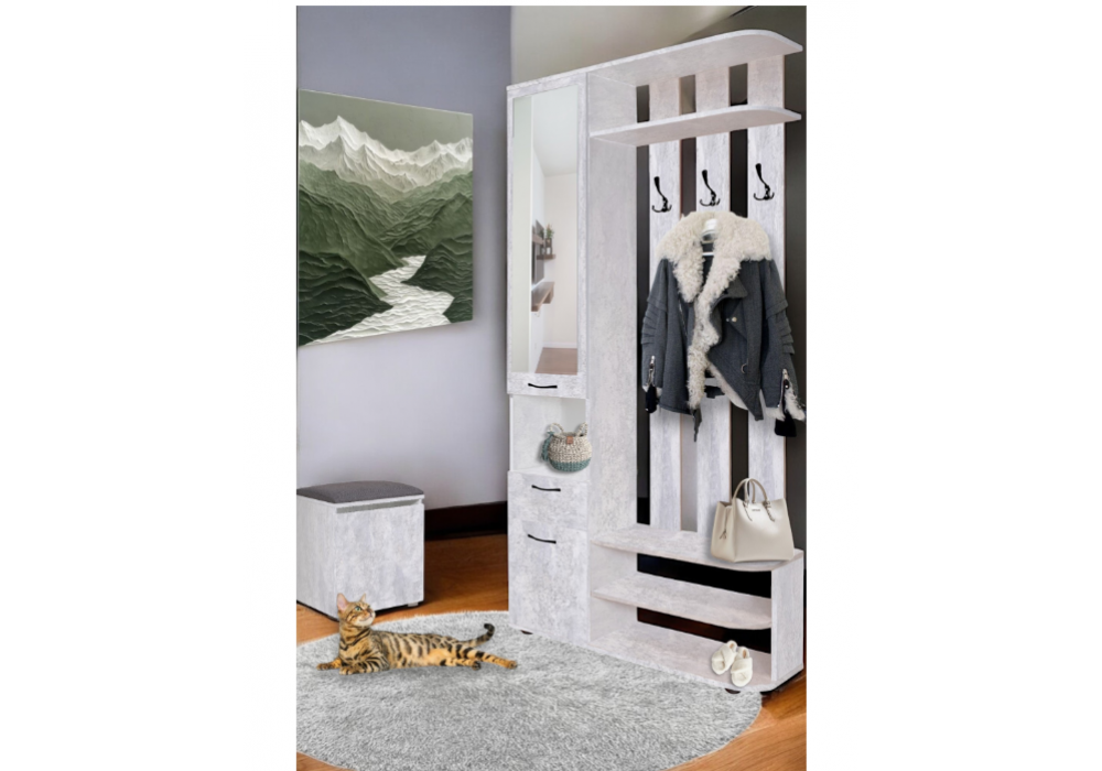Простая и компактная прихожая вместительна и функциональна, позволит разместить все необходимые вещи: обувь, верхнюю одежду, головные уборы и различные мелкие вещи. Благодаря гармоничному сочетанию цветов прихожая создаст в вашей квартире ощущение уюта, тепла и комфорта.
