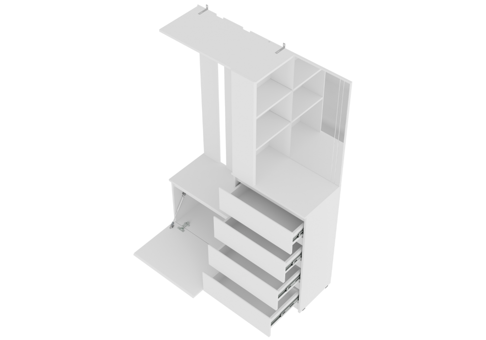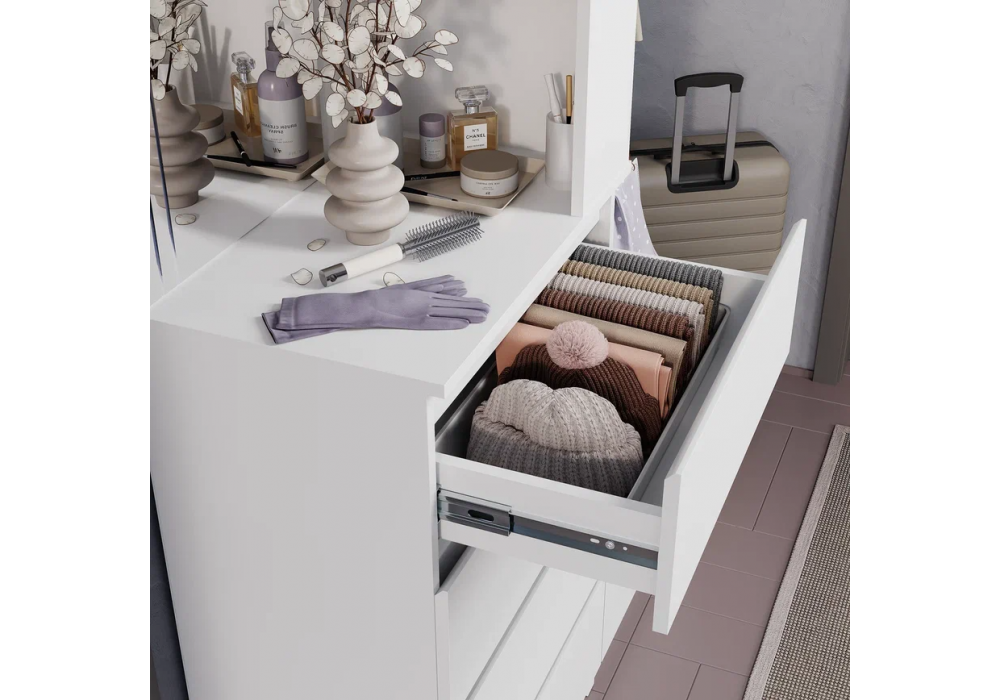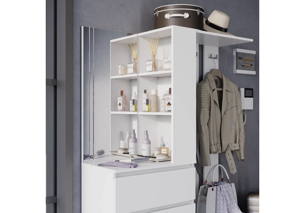 Встроенная обувница с секретерным кронштейном обеспечит удобный доступ к обуви, сохраняя ее в порядке. Рожковые крючки отлично подойдут для подвешивания верхней одежды, а боковые полки - для хранения туалетной воды и средств для макияжа.