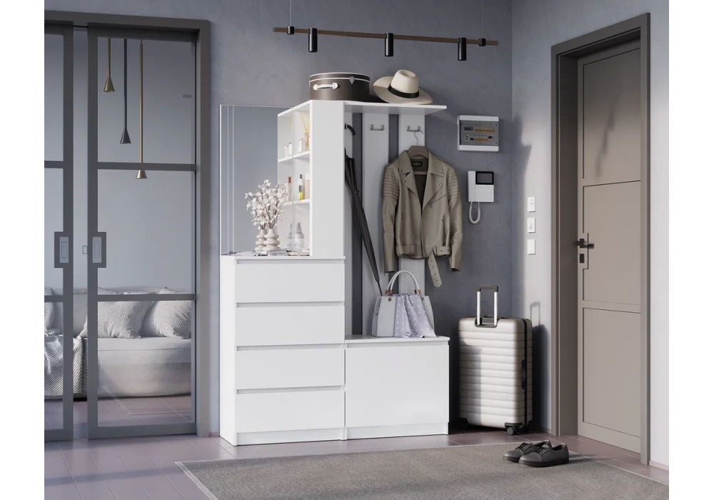 Эта многофункциональная конструкция для прихожей сочетает в себе удобство и практичность.