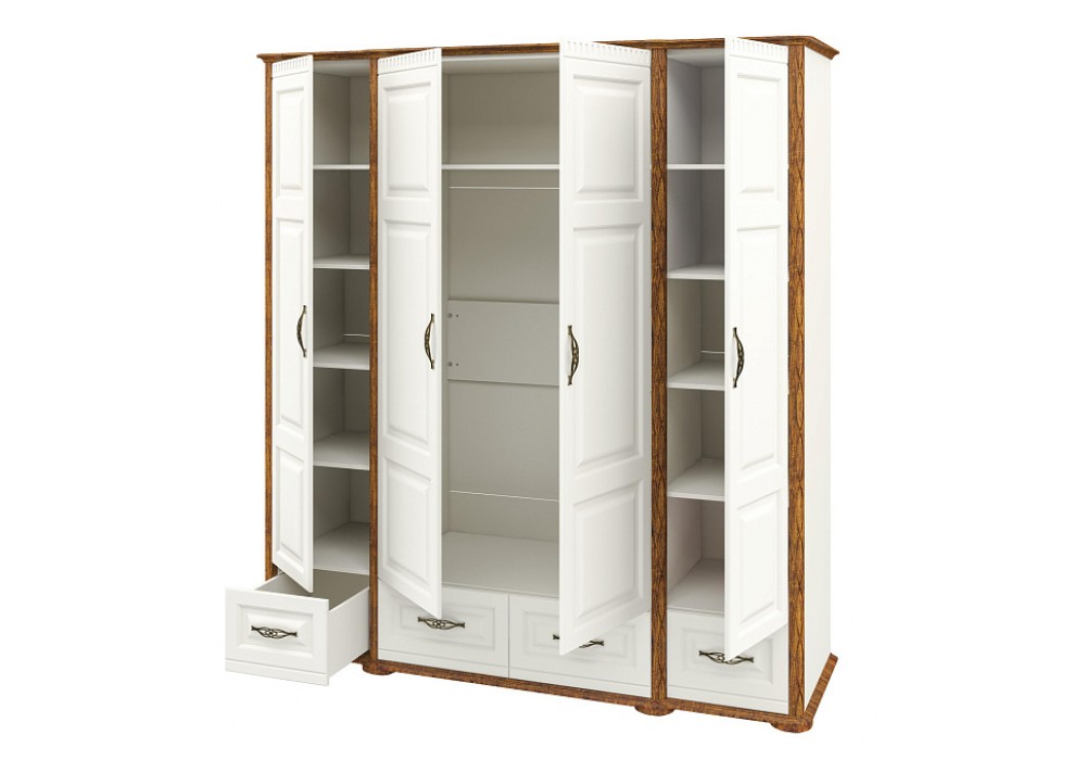 Четырехстворчатый шкаф для одежды Марсель МН-126-04 состоит из четырех секций: двух симметричных боковых для белья и центральной со штангой для одежды и верхней полкой. Ниже расположены 4 выдвижных ящика, которые оснащены бесшумными направляющими с германскими доводчиками. Данная модель на одну секцию больше, чем шкаф МН-126-03. Ручки шкафа - металлические.