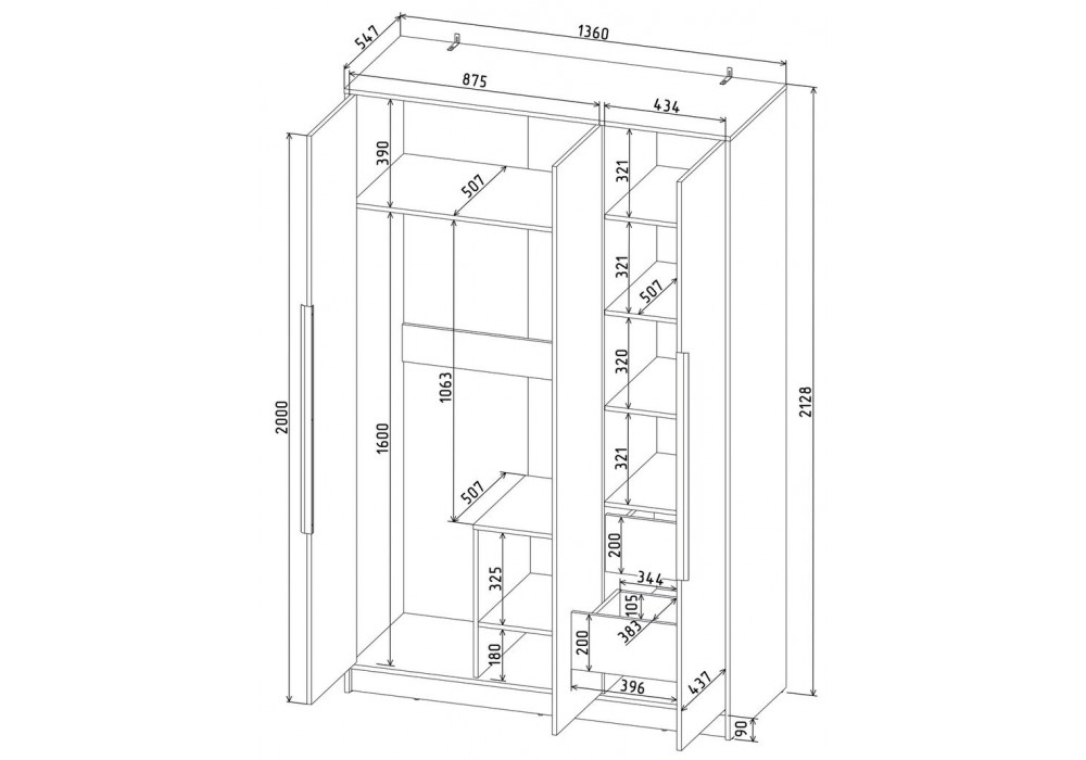 Габаритные размеры шкафа: 2128х1360х547 мм. (ВхШхГ)