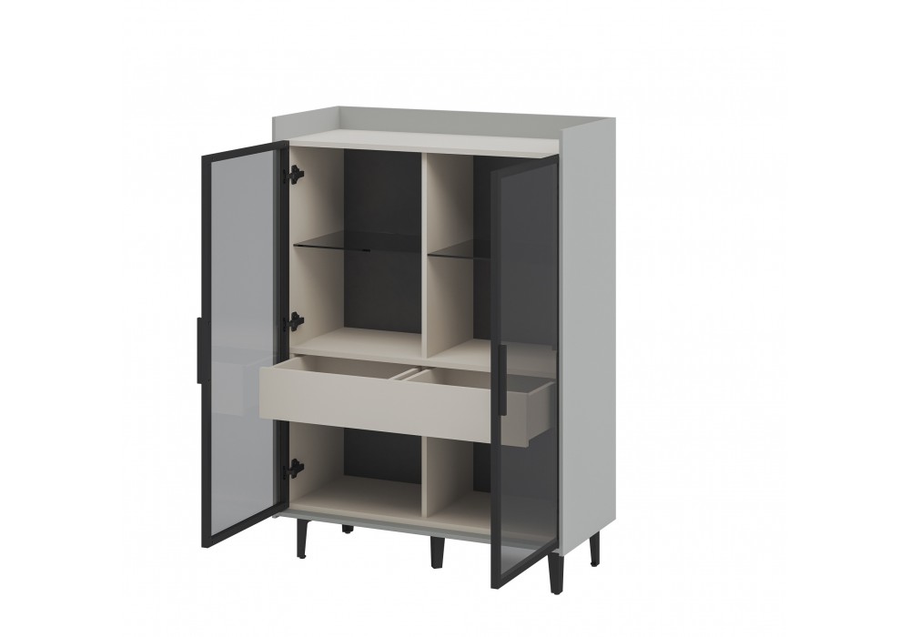 Шкаф комбинированный(низкий) с двумя распашными витринами с тонированным стеклом, алюминиевый профиль 20х20мм; цвет: чёрный брашированный; один выдвижной ящик с двумя секциями; бесшумными направляющими с доводчиком; петли плавного закрывания.