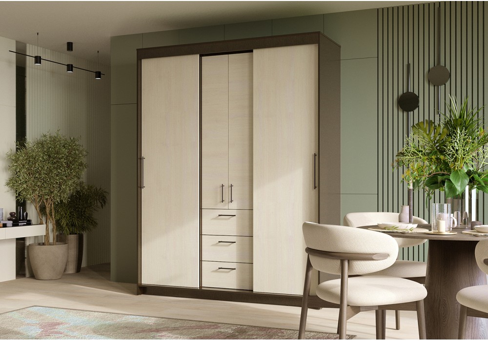 Комбинированный 4x-дверный шкаф, боковые фасады которого - это раздвижные двери. Стандартная глубина шкафа в 60 см позволяет разместить одежду на плечиках без помех для открытия раздвижных дверей, а полки создают вместительные ниши для крупных вещей, таких как постельное бельё, пледы, одеяла и подушки. Правая и левая секции оборудованы штангой для хранения одежды на плечиках и антресолью. В центральной части расположены 4 ниши для хранения и 3 выдвижных ящика, укомплектованных роликовыми направляющими, что станет приятным дополнением для удобного хранения полезных мелочей и небольших предметов гардероба.