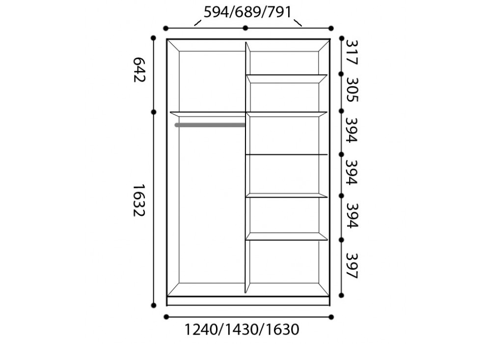 Описание изделия:Изделие представляет собой комбинированный шкаф-купе. Шкаф разделен вертикальной перегородкой на два отделения: платяное и бельевое отделение. Платяное отделение комплектуется одной верхней полкой и металлической штангой, бельевое - пятью полками. Раздвижные створки шкафа комплектуются декором из зеркал. Декор приклеивается к створке на фабрике.