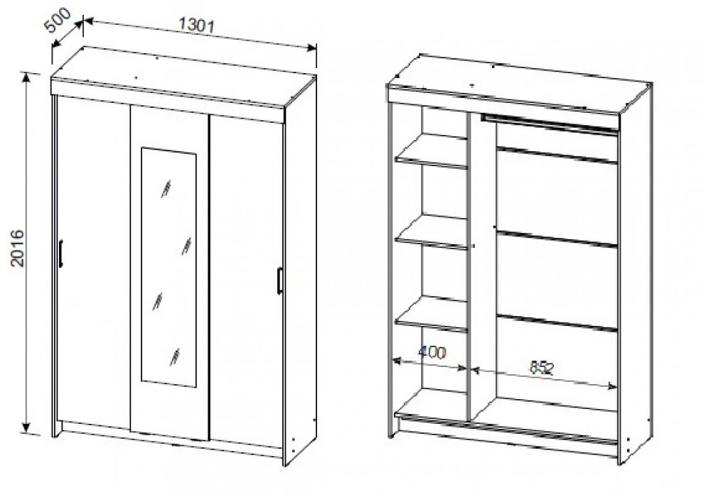 Описание изделия:Изделие представляет собой компактный трехстворчатый шкаф-купе. Шкаф разделен вертикальной перегородкой на два отделения. Справа платяное отделение шириной 852 мм, слева бельевое - шириной 400 мм. Платяное отделение комплектуется металлической штангой, бельевое - тремя полками. Средняя наружная створка шкафа изготавливается из ЛДСП в цвет корпуса и комплектуется зеркалом размером1300х300 мм. Зеркало приклеивается к створке на производстве. Зеркальная сборка невозможна.