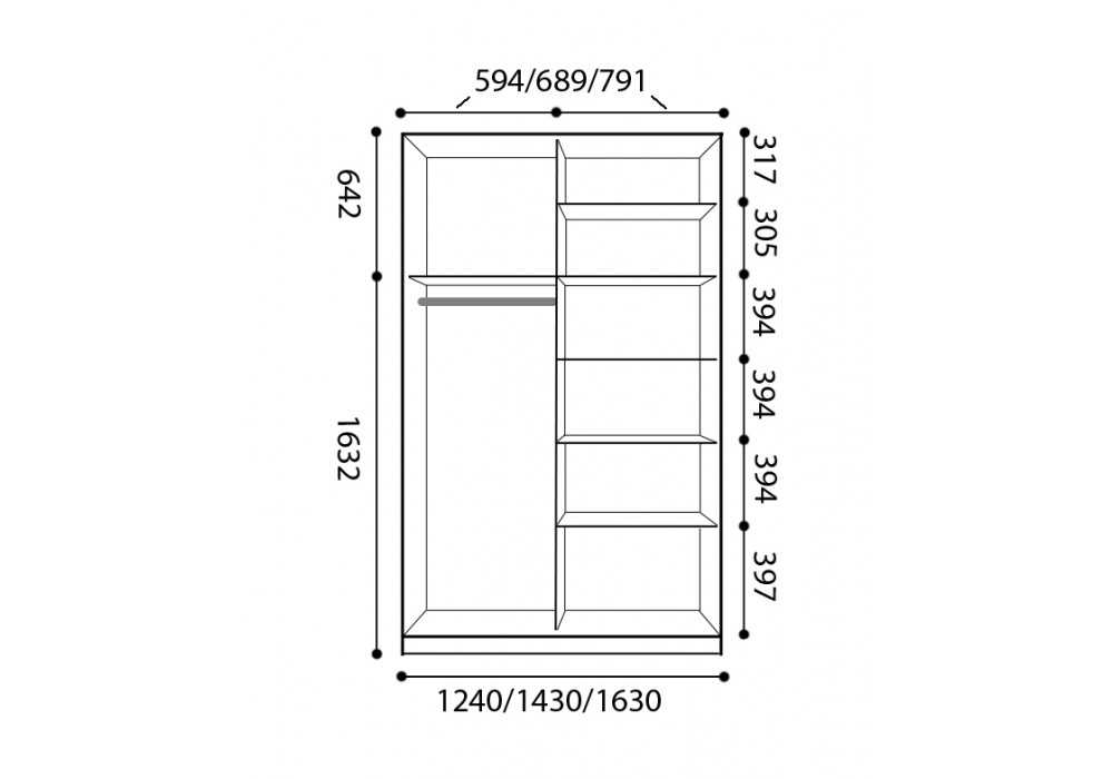 Описание изделия:Изделие представляет собой комбинированный шкаф-купе. Шкаф разделен вертикальной перегородкой на два отделения: платяное и бельевое отделение. Платяное отделение комплектуется одной верхней полкой и металлической штангой, бельевое - пятью полками.