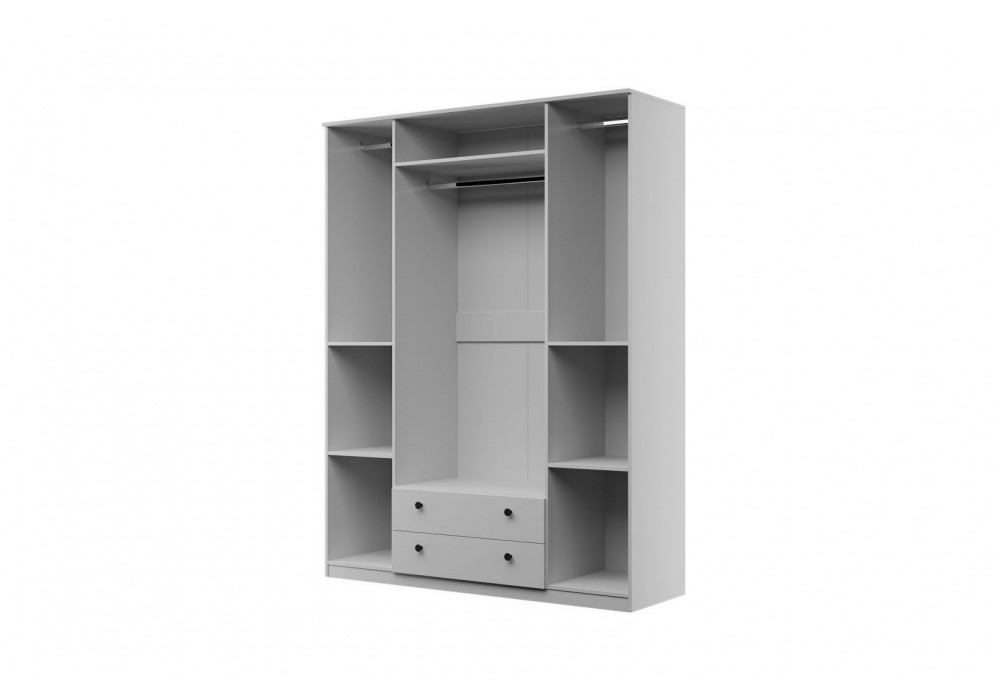 В центральной части шкафа расположена штанга для одежды и два ящика внизу. По крайним секциям находятся штанги и полки для дополнительного хранения.