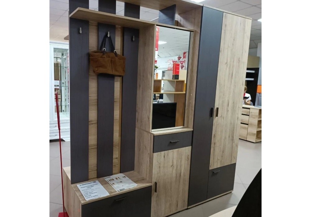 Состоит из 2-х модулей, шкафа и вешалки. Фасад с зеркалом имеет поворотный механизм, к которому прикреплены полки. При повороте зеркало смещается в шкаф, а перед вами остаются полочки.